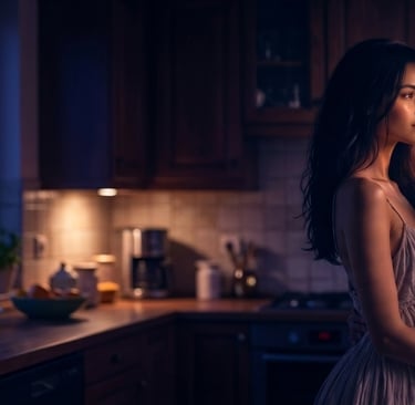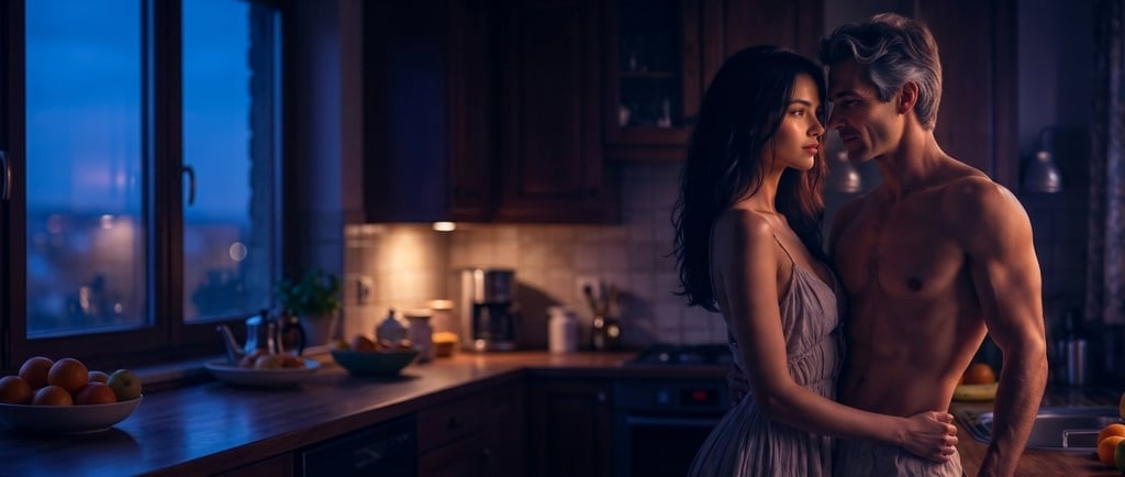 Nos quedamos quietos un momento, cuerpo con cuerpo, pegados y apoyados contra la mesada.Suavemente me dio vuelta y me dijo:—Qué hermosa sos…Puse mis dos manos en su cintura, mirando hacia arriba, ya que mi cabeza llega a su pecho… como dije antes, es bastante alto.Él puso una pierna entre las mías, me agarró con sus manos enormes la cara y me besó.